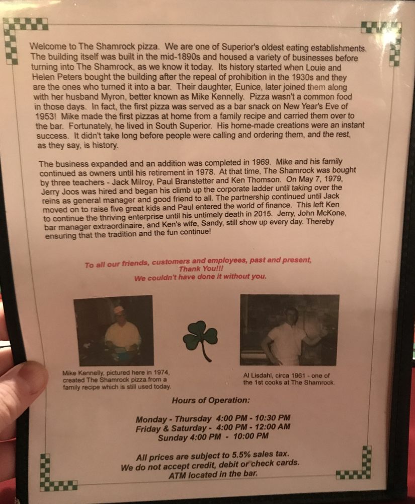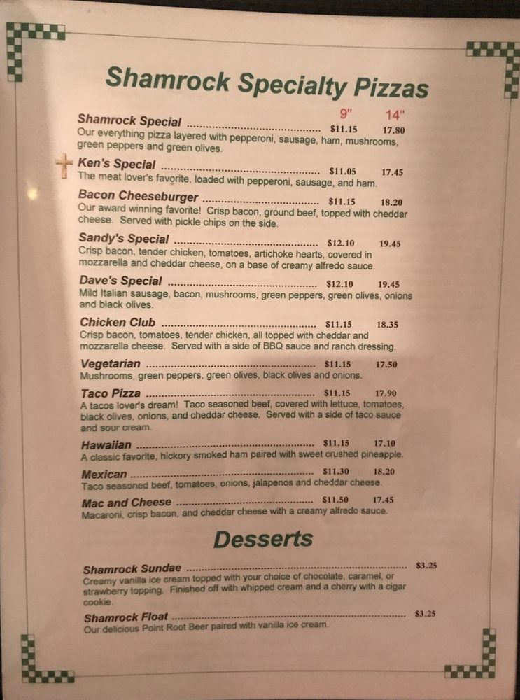 Shamrock Pizza, located in Superior, WI, is a beloved pizza joint with a cozy bar atmosphere. With a wide range of offerings including traditional and creative pizzas like the taco or cheeseburger pizza, it has been a favorite since the 80s. Customers rave about the perfect crispy crust and delicious toppings. The monthly special pizzas, like the Thanksgiving or Big Mac pizza, add to the excitement. Shamrock Pizza is not just a place for great food but also for creating memories, with many patrons visiting since childhood. The upgraded ambiance and fantastic menu make it a must-visit spot. Whether you're a pepperoni lover or enjoy switching it up, Shamrock Pizza is sure to satisfy your pizza cravings. Make sure to try their delicious offerings either dining in or taking it to-go!